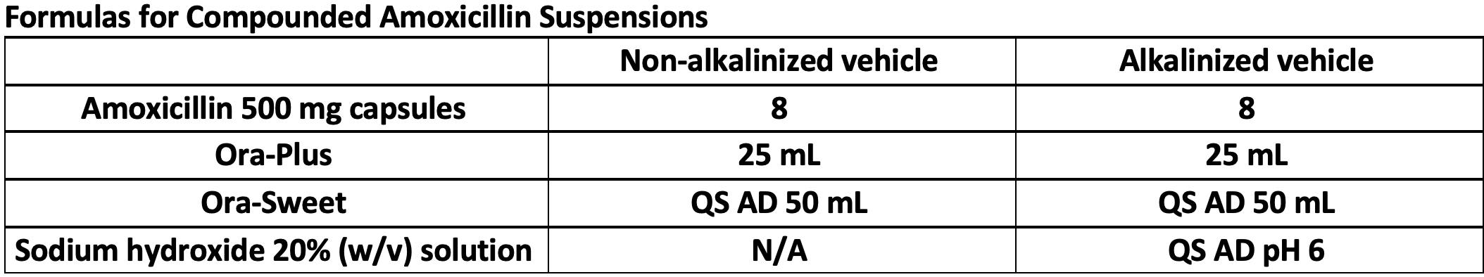 The primary objective of the study is to compound amoxicillin 400 mg per 5 mL oral suspension using 2 formulations. Amoxicillin 500 mg capsules were mixed in a vehicle of Ora-Plus and Ora-Sweet (1:1), as well as an Ora-Plus/Ora-Sweet vehicle alkalinized with sodium hydroxide 20% (w/v) solution to a pH of 6.