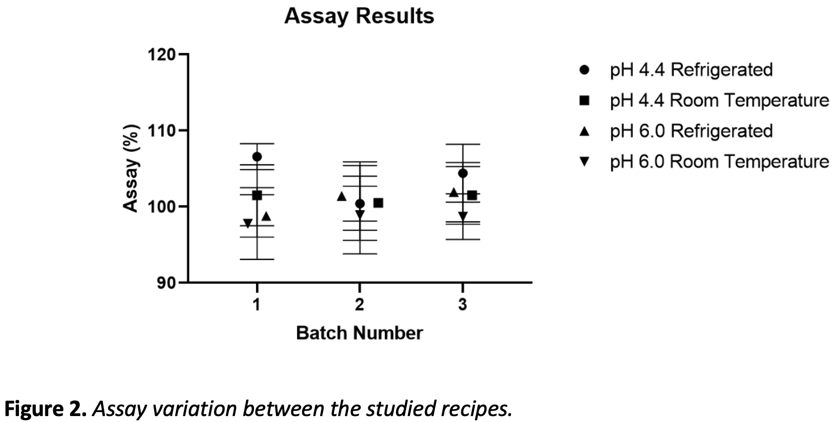The results for both preparations pH 6 and pH 4.4 at 2 storage temperatures, were comparable and with no significant difference (p > 0.4), in terms of the assay and pH. Regarding the physical characteristics, there were no changes, as shown in Tables 1 and 2.
